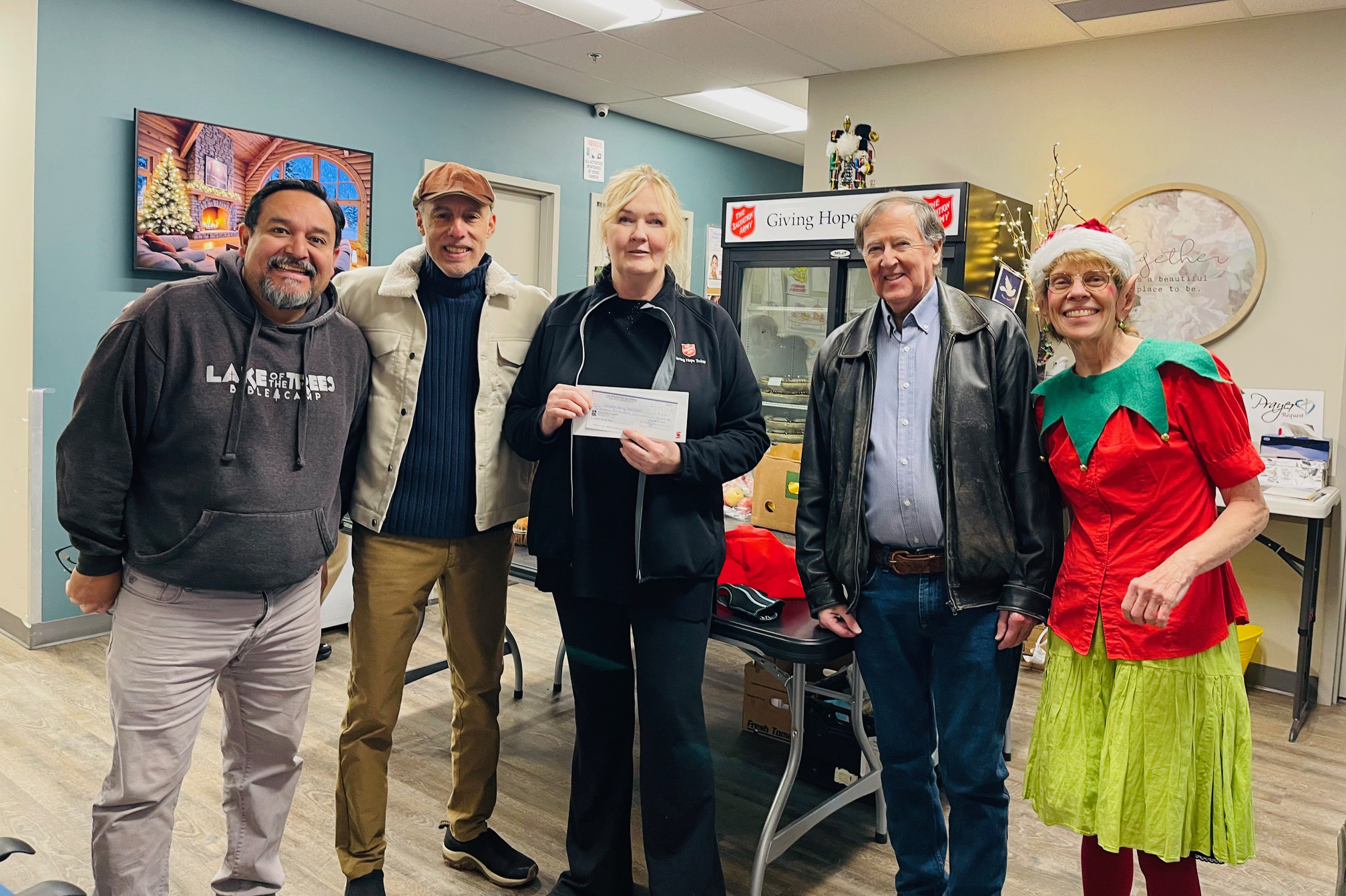 Reza Soufian and Rowly McPhersen present a cheque for $2500 to the Burlington Food Bank.